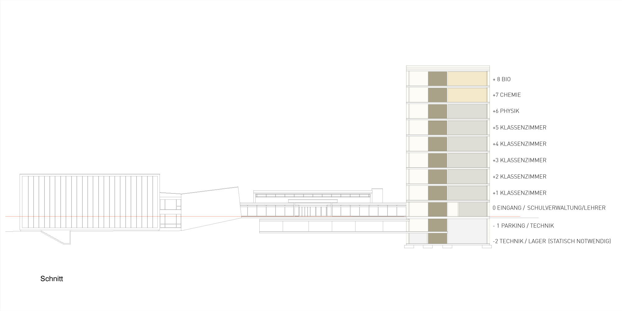 Das vierjährige Gymnasium soll im ehemaligen Lehrerseminar untergebracht werden. Die bestehende Schulanlage ist ein wichtiger baulicher Zeuge aus den späten 1950er-Jahren und steht unter Denkmalschutz. Die Umbaumassnahmen sind mit grösstmöglicher Sensibilität zu erfolgen. Die Schulanlage wird durch eine Doppelturnhalle und einem Ersatzvolumen für die Klassenzimmer ergänzt. Die Sporthalle wurde unterirdisch angeordnet, um die Anlage nicht mit einem grossen Volumen zu stark zu bedrängen. Der Neubau der Klassenzimmer ist neungeschossig und soll sich mit der Ausgestaltung auch von den bestehenden Baukörpern differenzieren. In den bestehenden Bauten werden weitere diverse kleinere Umbauten vorgenommen, um das gewünschte Raumprogramm unterzubringen. Mit der Abgabe der Projektplänen mussten ebenfalls die Erstellungskosten und die Lebenszykluskosten errechnet werden.