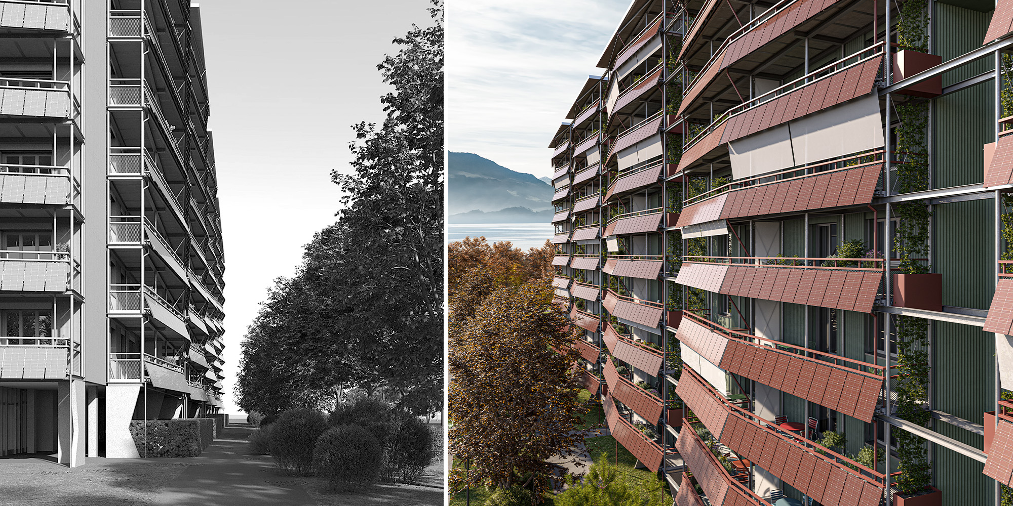 Die durchgehende Balkonschicht bildet das prägende Gestaltungselement des Projekts. Sie schafft grosszügige Aussenräume für die Wohnungen und wirkt gleichzeitig als architektonisches «Brise-Soleil», das natürliche Verschattung und Aufenthaltsqualität verbindet.