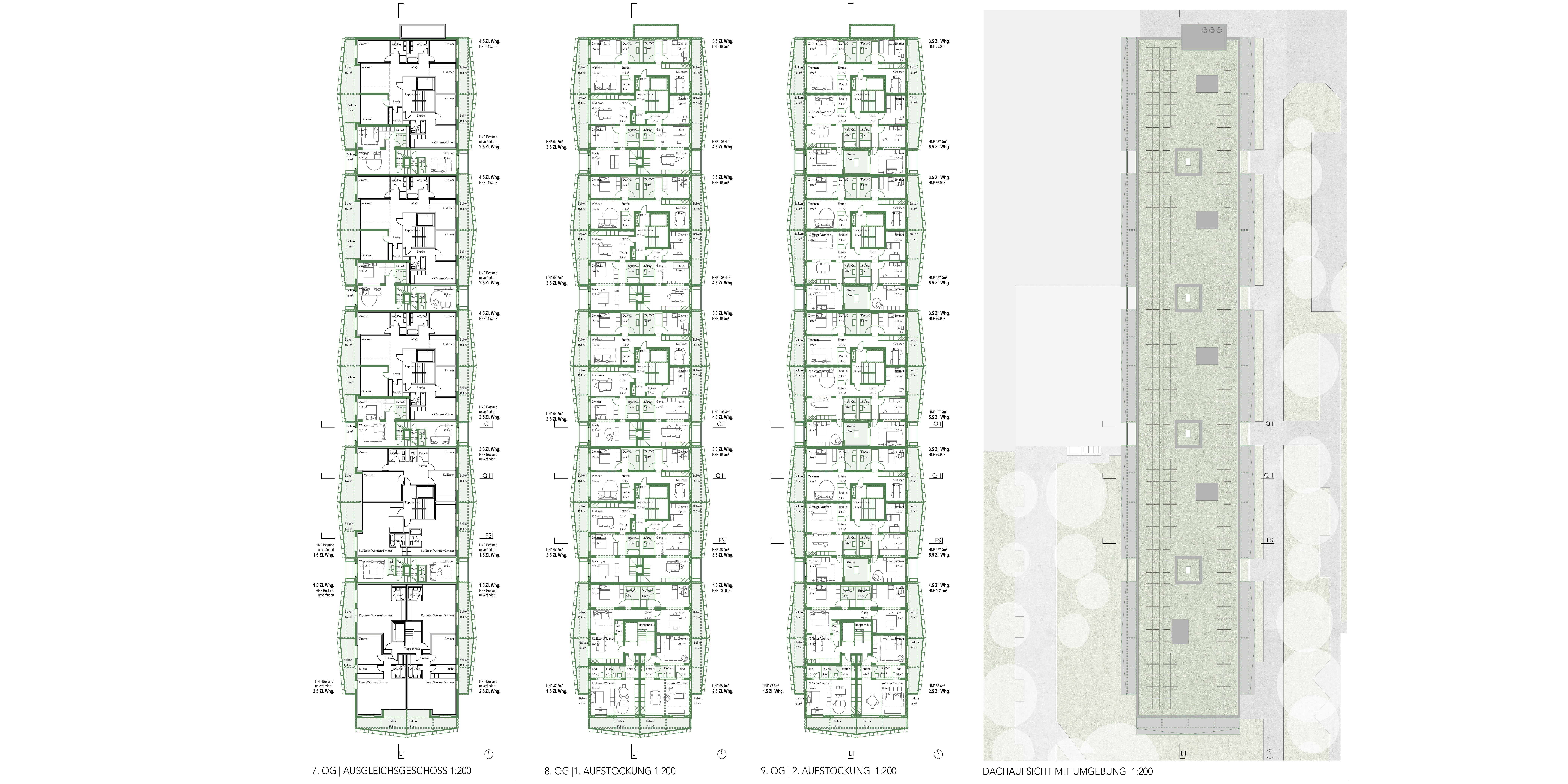 Aufgrund der begrenzten Geschosshöhen und der bestehenden Tragstruktur orientieren sich die neuen Grundrisse eng am Aufbau des Bestands. Insgesamt entstehen 26 zusätzliche Wohnungen, wobei pro Haus fünf bis sechs neue Einheiten vorgesehen sind.