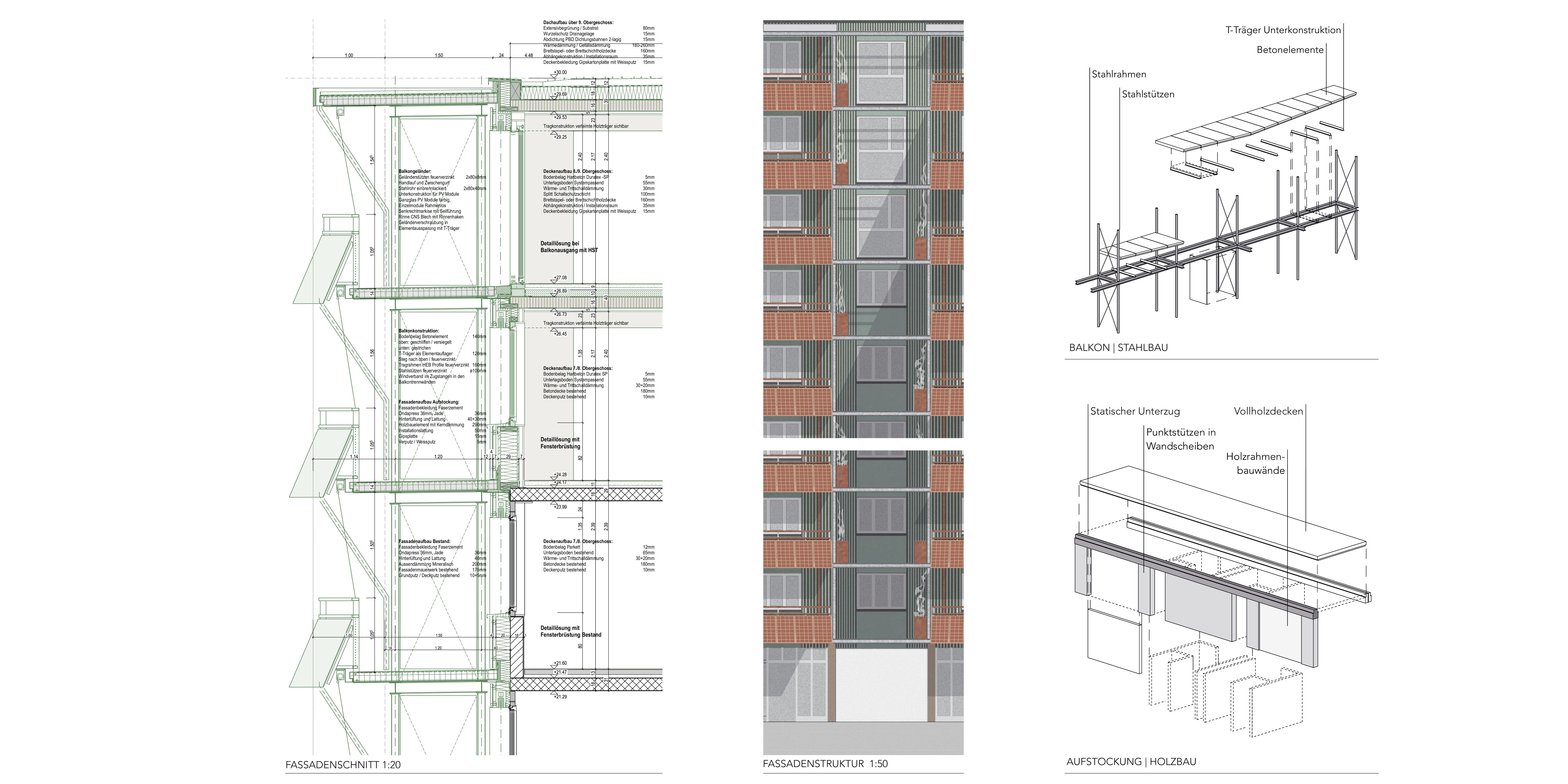 Die bestehenden Balkonplatten werden aufgrund der Wärmebrücken zurückgebaut und durch eine vorgestellte Stahlkonstruktion ersetzt. Diese trägt neue Fertigbetonplatten und ermöglicht eine modulare, rückbaubare Bauweise.